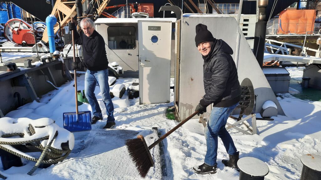 Al een aantal dagen ligt er wit spul aan dek van de graanzuiger. Vroeger zou men zeggen dat het stof van het graan is, maar helaas. We hebben te maken met een flink pak sneeuw. Een mooi gezicht, maar behoorlijk glad. Deze tremmers deden hun best om alles weg te krijgen, of het helpt?
